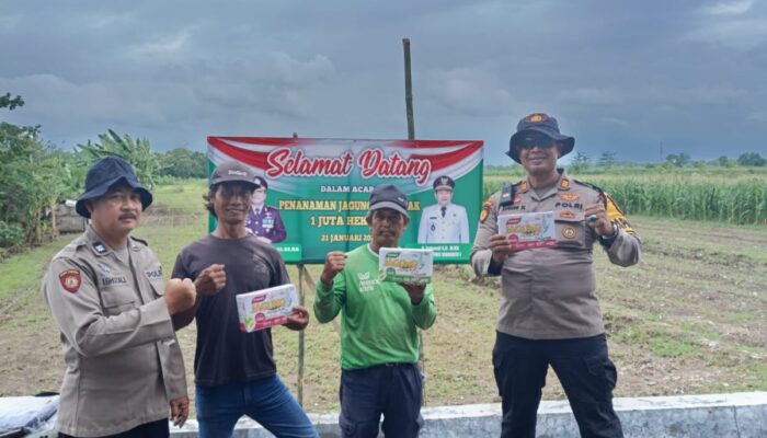 “Penyerahan pupuk penyubur dan pembasmi hama bagi tanaman jagung yang sudah berusia 14 hari dan 40 hari ini sangat penting, agar hasil panen petani dapat optimal,” ujar Kapolsek Balongbendo AKP Sugeng Sulistiyono.