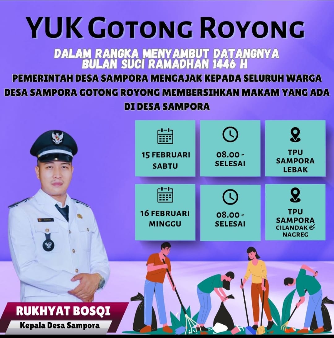 “Sebentar lagi kita akan menjalankan ibadah Puasa,seluruh jajaran kantor desa Sampora mengajak warga gotong royong membersihkan lingkungan,terutama sekarang musim hujan agar tidak ada bencana banjir di wilayah kita,serta dengan lingkungan yang bersih maka kita menjalankan ibadah puasa dengan nyaman,Selamat menjalankan ibadah puasa,Mohon maaf lahir dan bathin semoga kita semua sehat,berkah,dan sukses selalu.