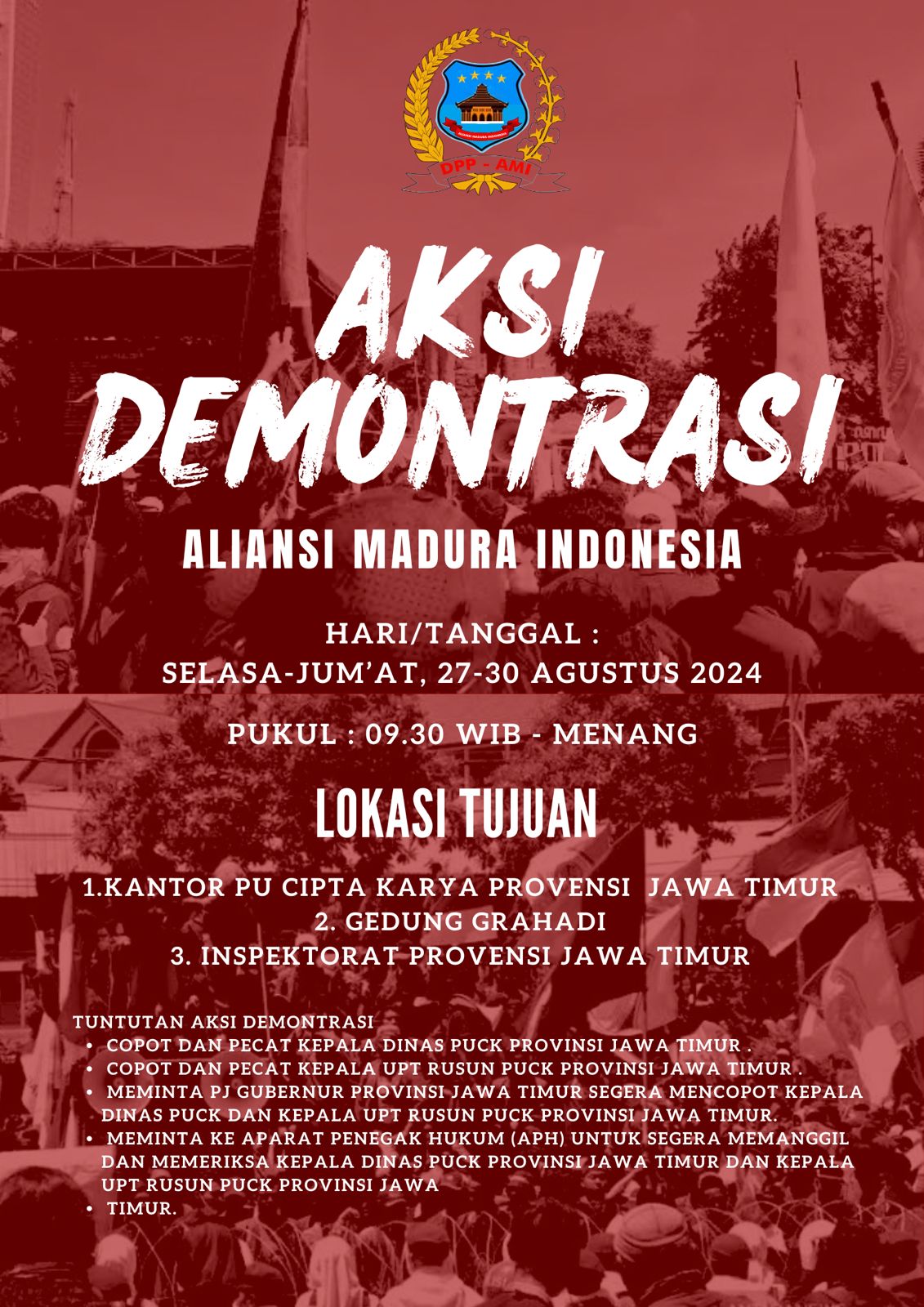 Demo besar-besaran Aliansi Madura Indonesia (AMI) akan di laksanakan pada hari Selasa – Jum’at 27 – 30 Agustus 2024 terkait dugaan Mark Up dengan berbagai modus yang terjadi di UPT Rusun Dinas Perumahan Rakyat, Kawasan Permukiman dan Cipta Karya Provinsi Jawa Timur.