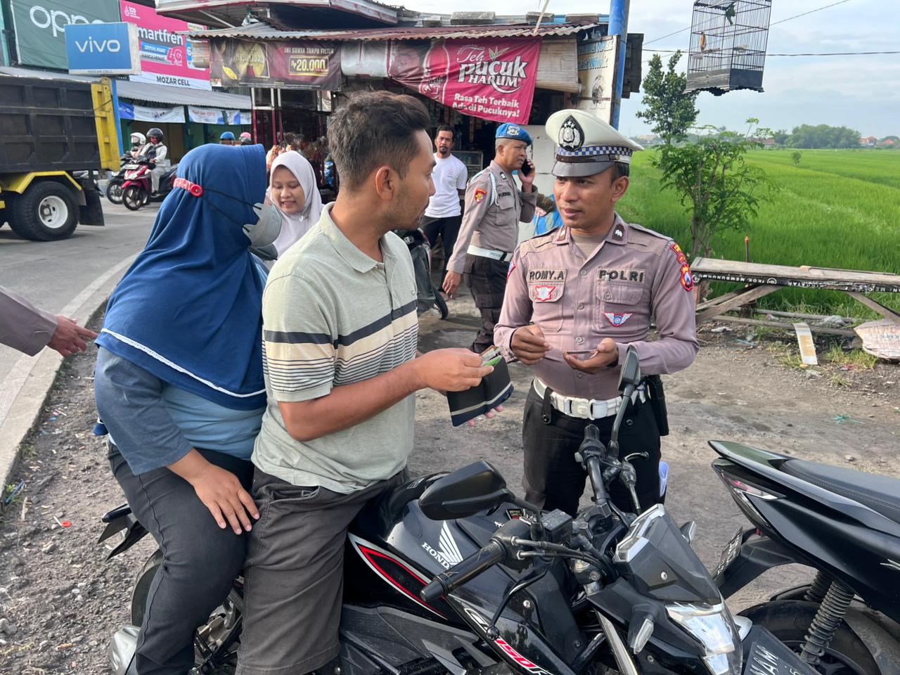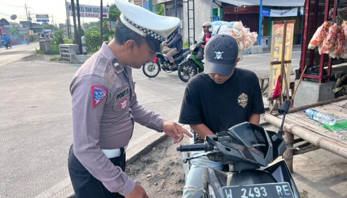 idetik.id | Jawa Timur – Polisi mengedukasi pengendara yang tidak memakai helm SNI saat melintas di Simpang Tiga Sawocangkring, Wonoayu, Sidoarjo, Minggu (16/2/2025).
