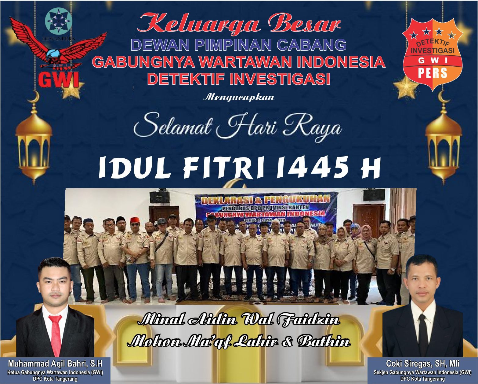 Jajaran Pengurus dan Anggota GWI DPC Kota Tangerang Mengucapkan ” Selamat Hari Raya Idul Fitri 1 Syawal 1445 H, kepada Pemerintah Kota Tangerang, DPRD Kota Tangerang, Pengadilan Negeri Tangerang, Kejaksaan Negeri Tangerang, TNI, Polri maupun instansi lainnya dan seluruh masyarakat Kota Tangerang.