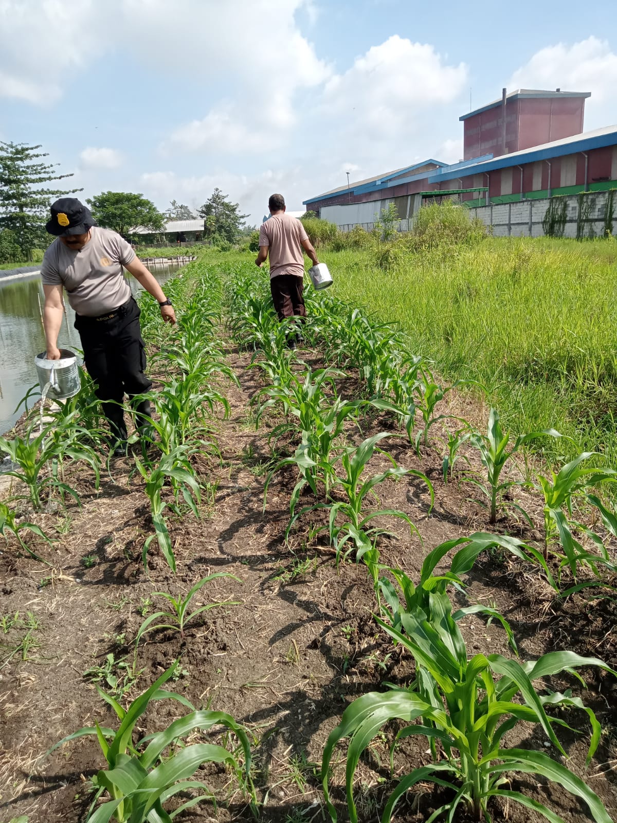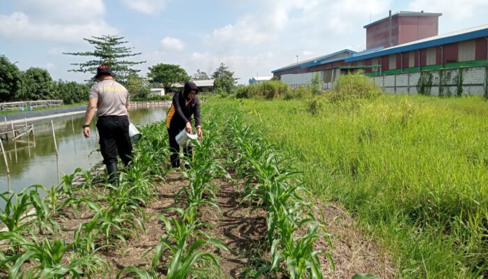 idetik.id | Jawa Timur – Kapolsek Krian Kompol I.G.P. Atma Giri dan anggota meninjau penyiraman tanaman jagung, dalam rangka mendukung program ketahanan pangan di Desa Ponokawan, Krian, Sabtu (15/2/2025).