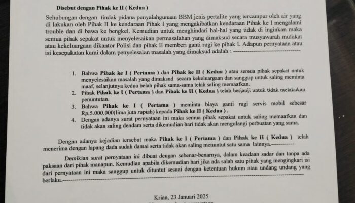 idetik.id |Sidoarjo – Kasus BBM eceran bercampur air, yang terjadi di salah satu pedagang eceran di Desa Sedenganmijen, Krian, Sidoarjo dengan korban si pemilik kendaraan berakhir damai. Pedagang BBM eceran yang diketahui bernama Rio Febrian asal Tarakan Barat, Kota Tarakan, telah mengganti kerugian yang dialami korban yakni Muhammad Aji Rahmayuda, warga Urang Agung, Sidoarjo.