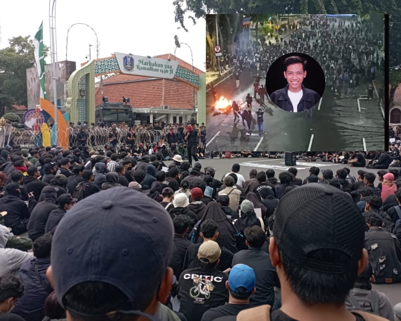Menurut keterangan Rama Indra, ia meliput aksi unjuk rasa sejak pukul 14.16 WIB. Aksi demonstrasi awalnya berlangsung damai, namun mulai ricuh pada pukul 16.22 WIB saat massa aksi melempari botol ke arah barikade polisi di depan Gedung Grahadi. Kericuhan semakin memanas dengan lemparan batu, petasan, dan molotov. Bentrokan sempat terhenti saat azan Maghrib untuk berbuka puasa, di mana beberapa pendemo telah diamankan ke dalam gedung.