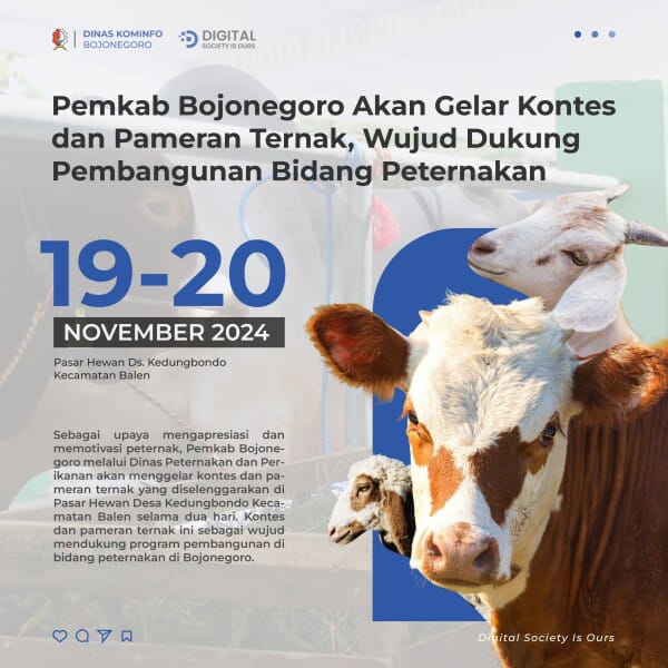 “Pemkab Bojonegoro akan menggelar kontes dan pameran ternak 2024, yang akan berlangsung selama dua hari mulai tanggal 19-20 November 2024 di Pasar Hewan Desa Kedungbondo Kecamatan Balen,”ucap Kepala Dinas Peternakan dan Perikanan Bojonegoro Catur Rahayu.