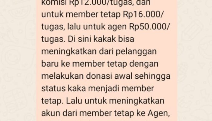 Berawal dari wanita Surabaya berinisial W tergabung dalam grup wattshapp event ramadhan yang mana di dalam grup tersebut terdapat admin yang mengaku nama Alisa (089678225113) memberikan tugas yang bisa menghasilkan komisi.