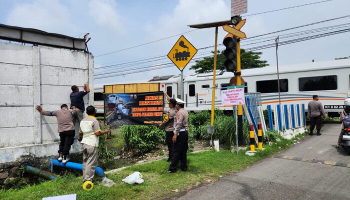 idetik.id |™SIDOARJO – Peduli akan keselamatan masyarakat saat melewati perlintasan kereta api tidak berpalang, Polisi memasang spanduk dan banner berisi himbauan hati-hati bagi para pengguna jalan.