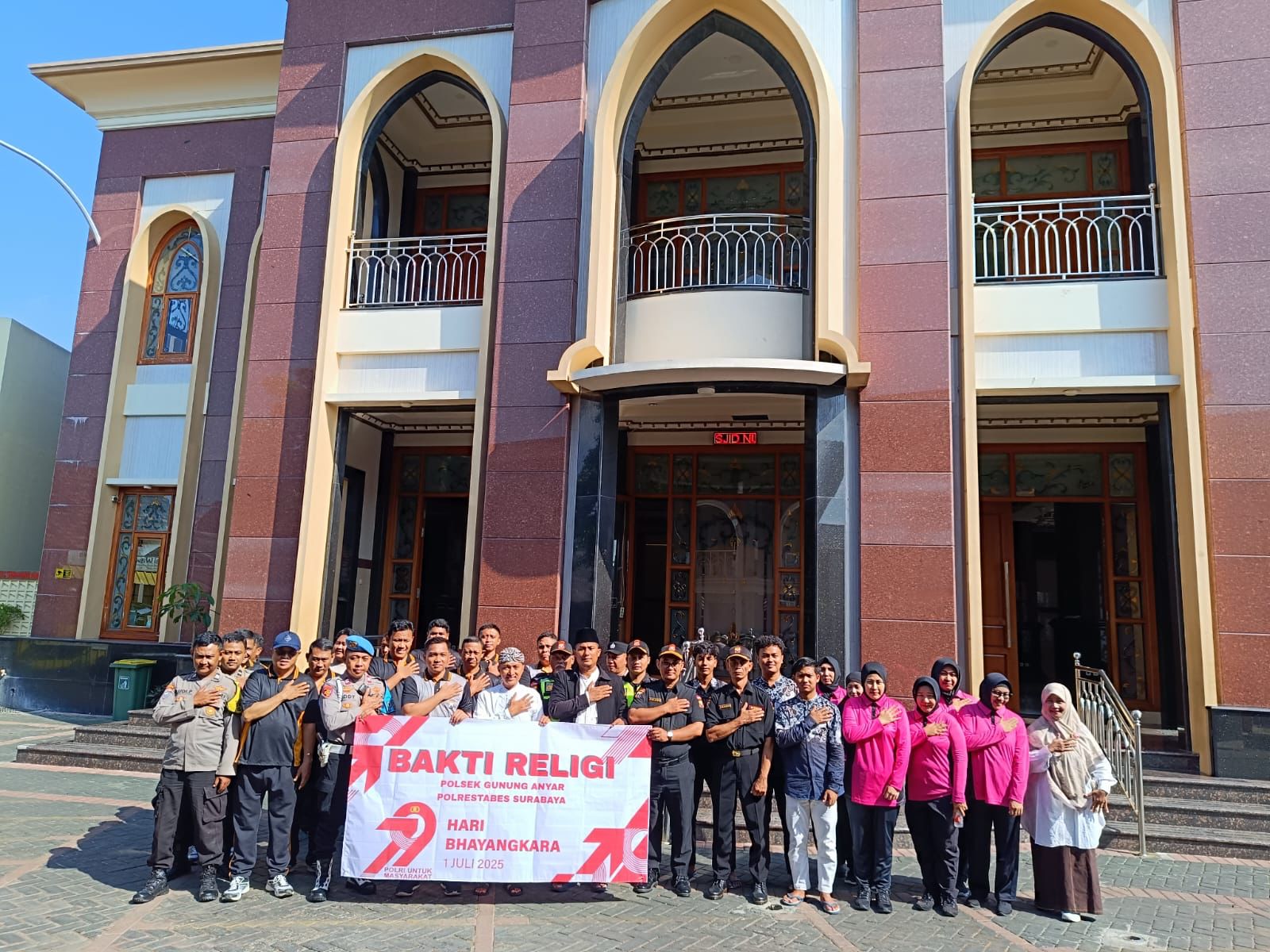 idetik.id | Jawa Timur – Kapolsek Gunung Anyar Iptu Sumianto Harsya Fahroni, S.H., M.H. didampingi Ketua Bhayangkari Ranting Gunung Anyar Ny. Zhelvy Harsya beserta pengurus dan seluruh anggota Polsek Gunung Anyar melaksanakan kegiatan Bakti Religi dalam rangka menyambut HUT ke-79 Bhayangkara Tahun 2025 di tempat ibadah wilayah Gunung Anyar Tengah, yakni Masjid Nurul Hikmah.