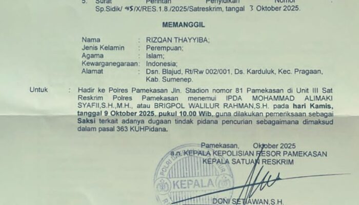 Rizqan Thayyiba diminta hadir di Polres Pamekasan di Unit III Satreskrim, menemui Ipda Mohammad Alimaki Syafii atau Brigpol Walilur Rahman, pada Kamis, 9 Oktober 2025. Pemanggilan berdasarkan surat nomor S.Pgl/613/X/Res/1.8/2025/Satreskrim, yang ditandatangani oleh Kepala Satuan Reserse Kriminal (Satreskrim) Polres Pamekasan, AKP Doni Setiawan.