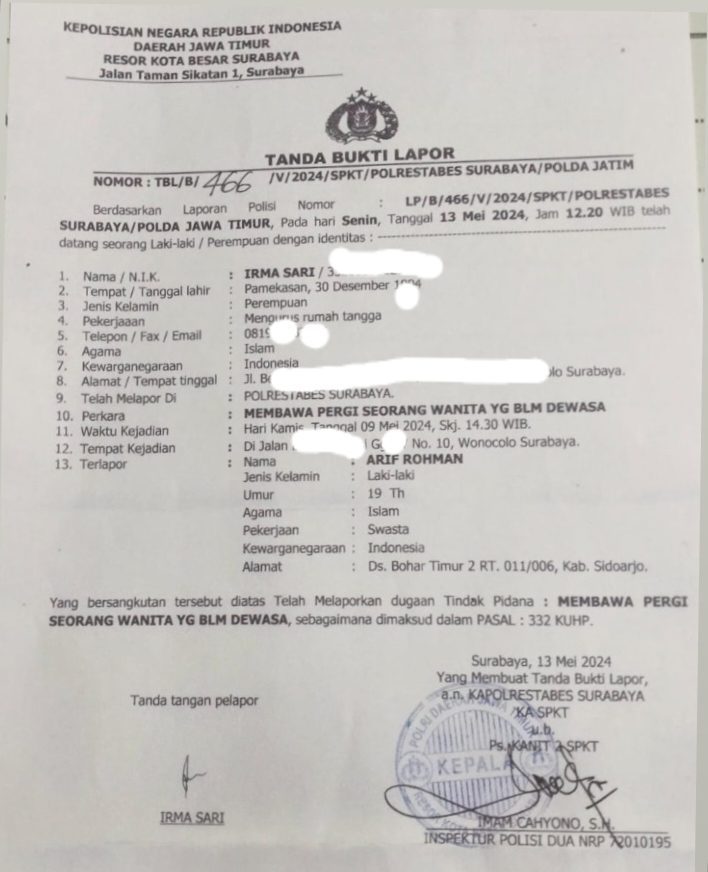 Terlapor ialah Arif Rohman (19 tahun), warga Desa Bohar, Kabupaten Sidoarjo. Dari keterangan Irma Sari, putrinya tersebut dibawa kabur oleh Arif Rohman, pria yang dikenalnya melalui Facebook pada Kamis (9/5/2024).