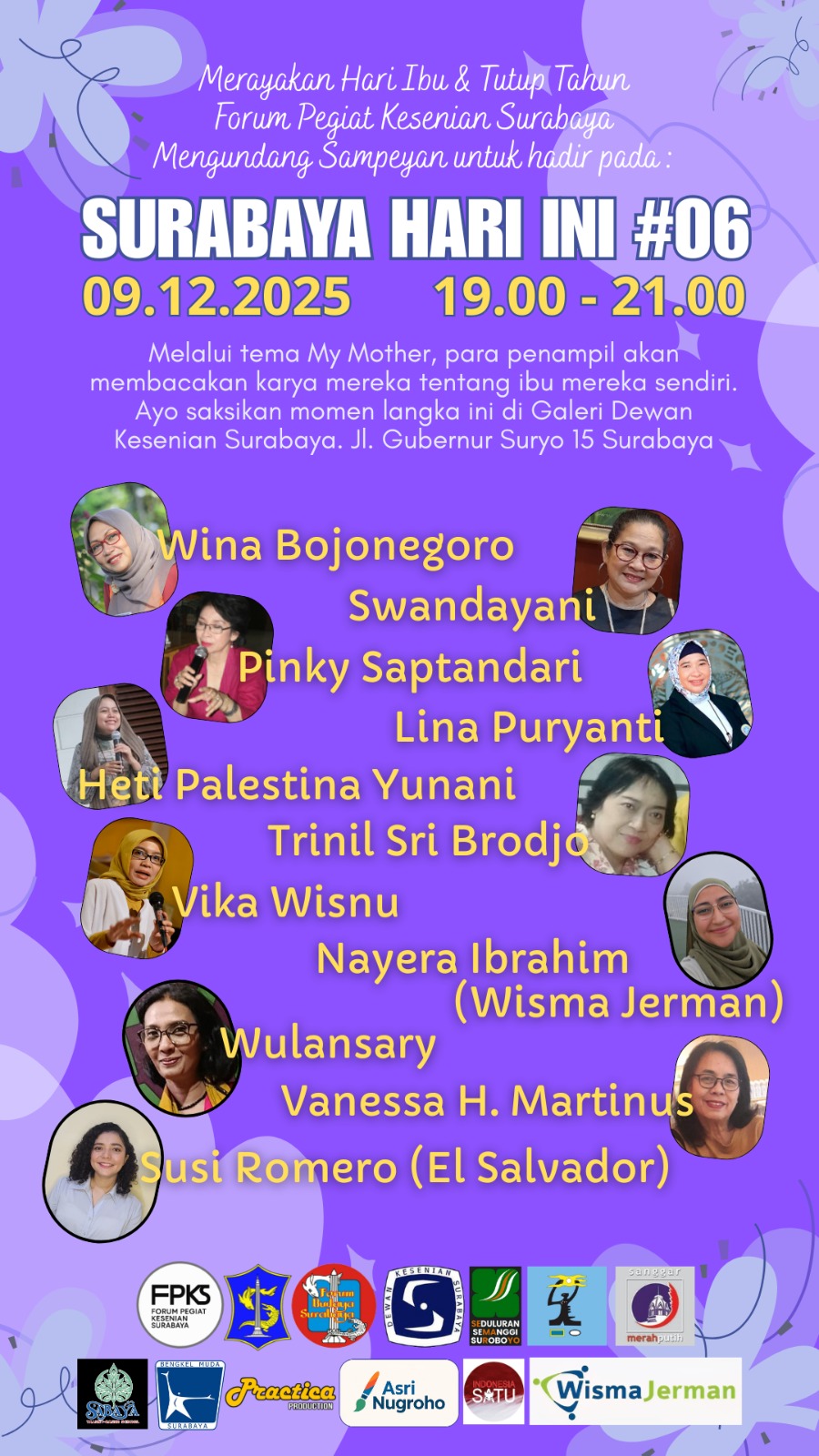 idetik.id. ||. Surabaya – Sebelas perempuan hebat dari berbagai disiplin akan merayakan Hari Ibu sekaligus menutup tahun pada acara Surabaya Hari Ini #06 yang digelar Forum Pegiat Kesenian Surabaya (FPKS) pada 09 Desember 2025, di Galeri Dewan Kesenian Surabaya, Kompleks Balai Pemuda, Jl. Gubernur Suryo No 15 Surabaya.