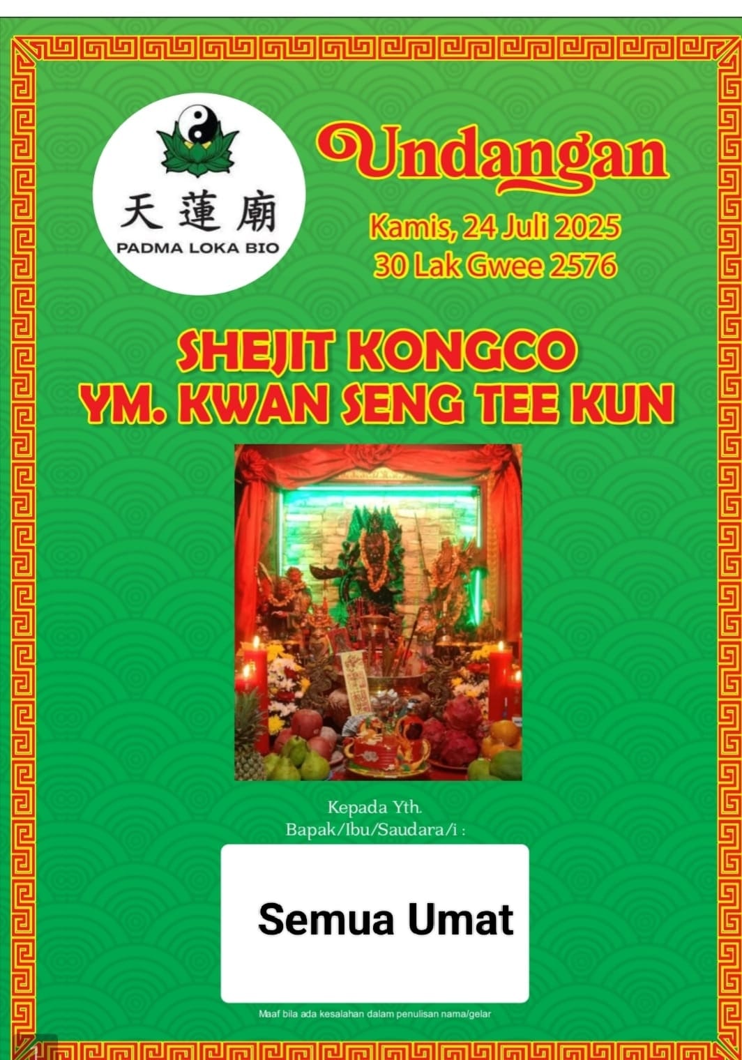 idetik.id | Kota Tangerang – Vihara Padma Loka Bio, yang terletak di Jalan Cikahuripan Sewan Rawan Kucing RT 02/06 No. 48 (Masuk Gg. Bakmi Koyan), Mekarsari, Neglasari, Kota Tangerang, menjadi tuan rumah acara Shejit YM. Kongco Kwan Seng Tee Kun.