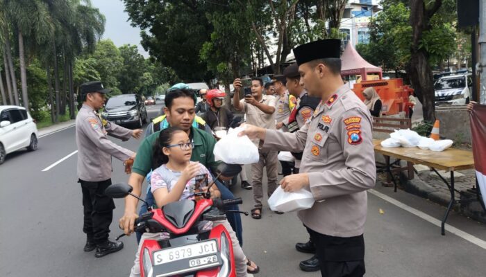 idetik.id | Surabaya – Dalam rangka menyemarakkan bulan suci Ramadhan, Polsek Wonocolo Surabaya bersama Bhayangkari Ranting Wonocolo menggelar aksi sosial dengan membagikan 200 paket takjil kepada masyarakat yang melintas di Jalan Raya Jemursari Surabaya, pada Kamis, 13 Maret 2025.